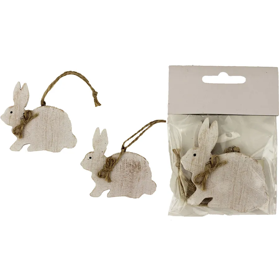 Set Holzhasen zum Aufhängen. Das Set enthält 2 Hasen. Maße: 7 x 0,5 cm, Höhe 6,5 cm. Material: Holz.
