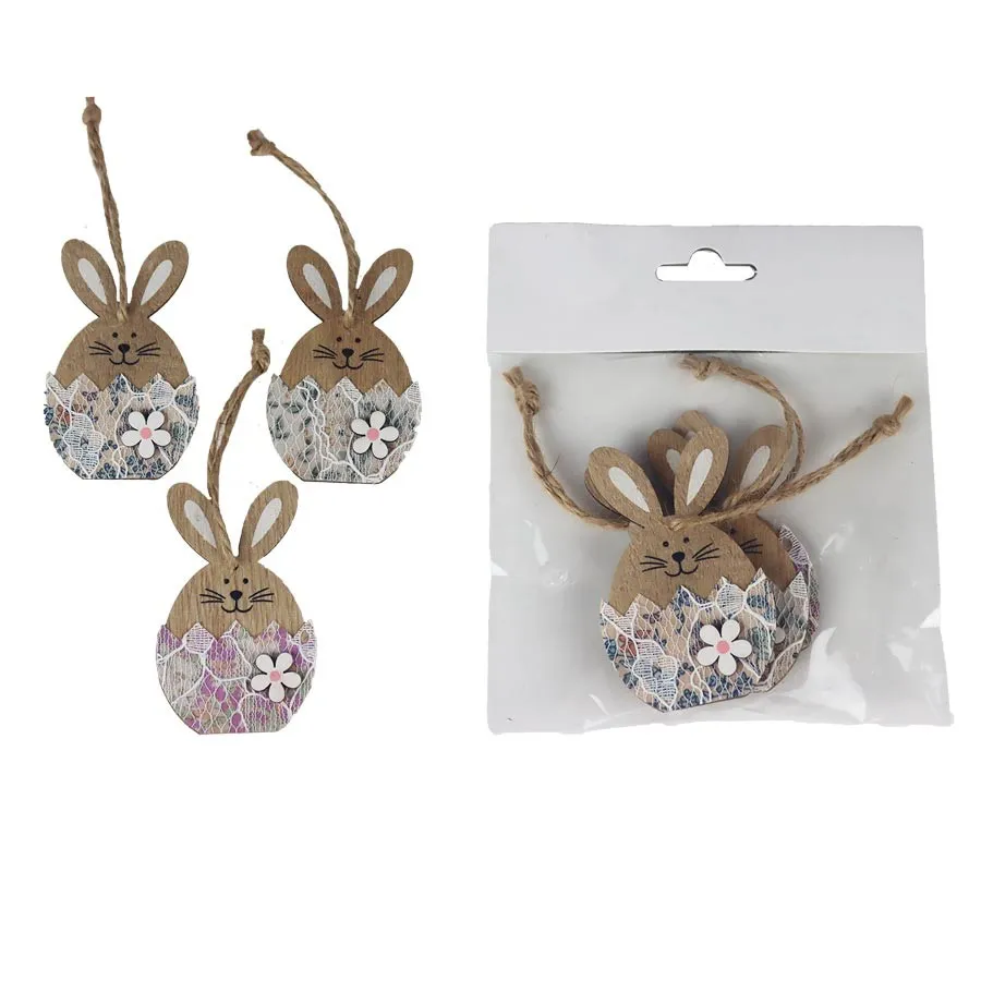 Set Dekohasen zum Aufhängen. Das Set enthält 3 Dekorationen. Maße: 5 x 0,4 cm, Höhe 7,5 cm. Farbe: natürliche Kombination mit Weiß, Rosa, Blau. Holzwerkstoff, Textil.