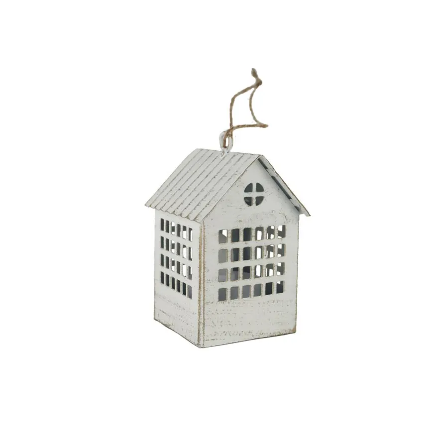 Metall-Laterne mit LED. Dekoration mit Motiv des Hauses.