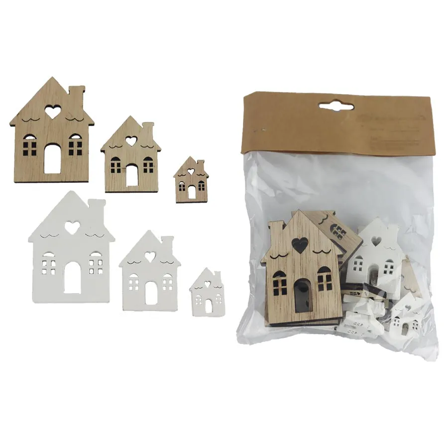 Eine Reihe dekorativer Häuser. Das Set enthält 18 Häuser in drei Größen. Maße: 2 - 5 x 0,5 cm, Höhe 2,8 - 6,8 cm. Farbe: Weiß, natürliche Kombination. Material auf Holzbasis.