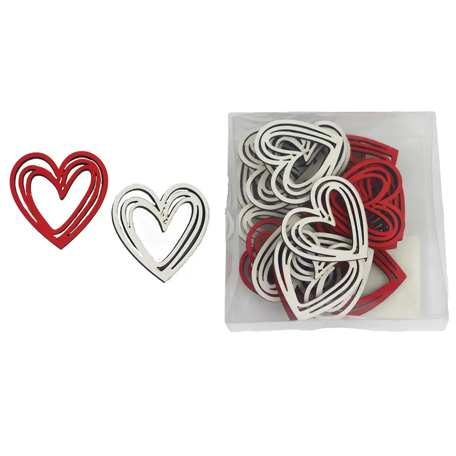 Set dekorative Herzen. Das Set enthält 24 Herzen. Abmessungen: 4 x 3,8 cm, Dicke 0,3 cm. Farbe: Kombination Weiß, Rot. Material auf Holzbasis.
