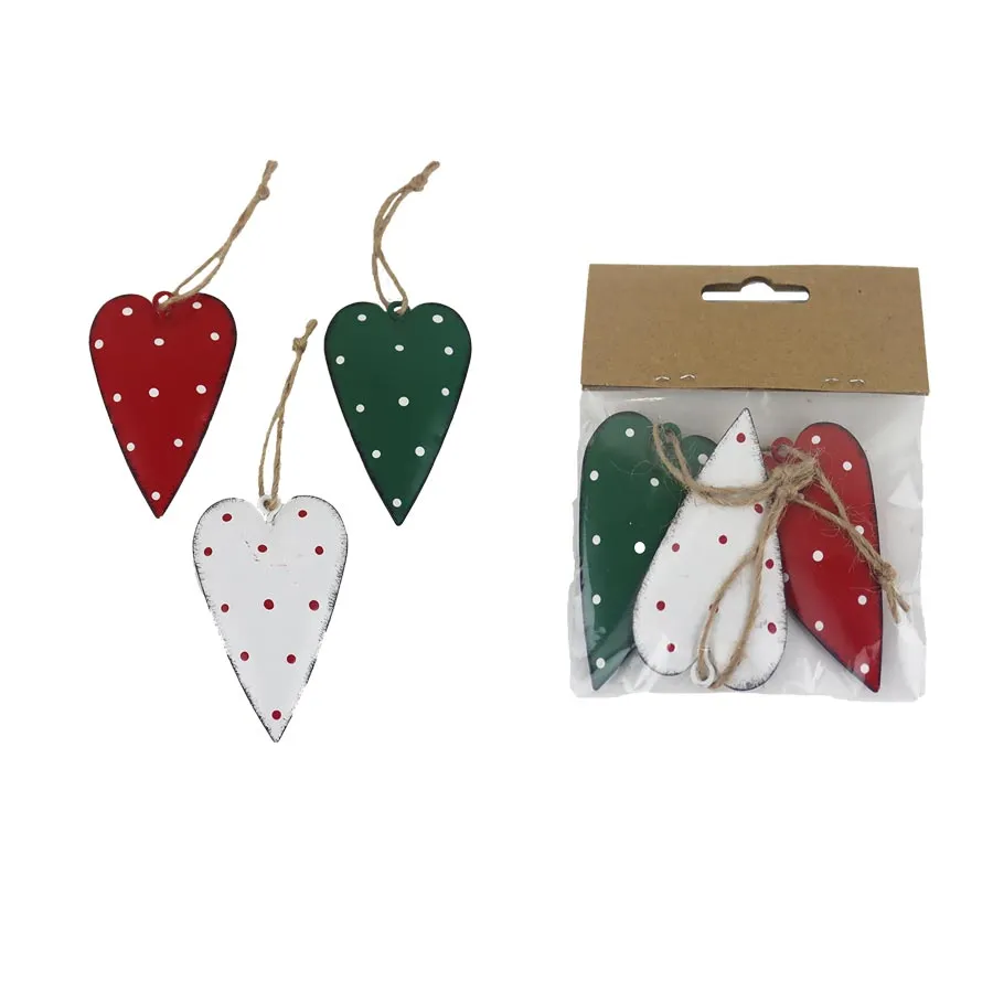 Set von dekorativen Herzen zum Hängen. Das Set enthält 3 Herzen. Maße: Farbe: Kombination von Grün, Rot, Weiß. Material: Metall.
