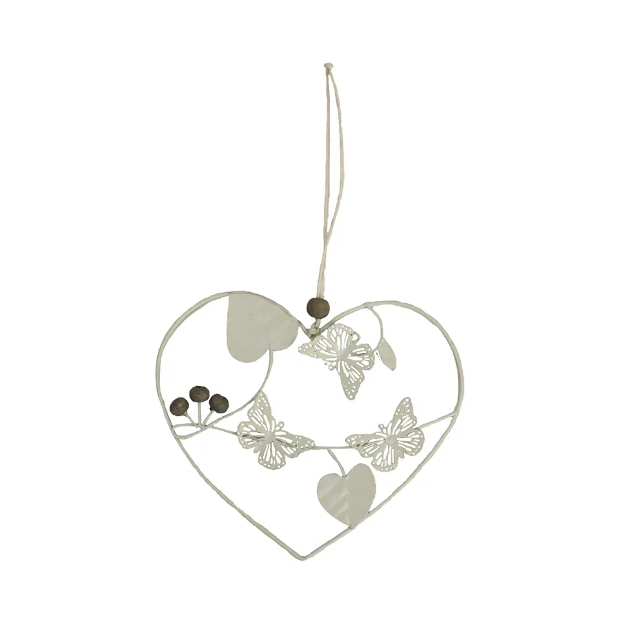 Hängend Herz mit Schmetterlingen. Maße: Breite 12 cm, Dicke 0,5 cm, Höhe 10,6 cm. Farbe: Weiß. Material: Metall.
