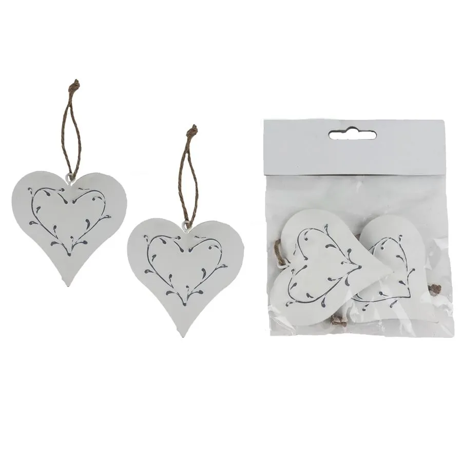 Set Deko-Herzen zum Aufhängen. Das Set enthält 2 Herzen. Abmessungen: 7,8 x 7,8 cm, Dicke 1,5 cm. Weiße Farbe. Material: Metall.