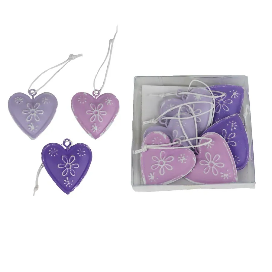 Set Deko-Herzen zum Aufhängen. Das Set enthält 6 Herzen. Abmessungen: 4 x 4 cm, Dicke 0,6 cm. Farbe: Rosa, Lila-Kombination. Material: Metall.