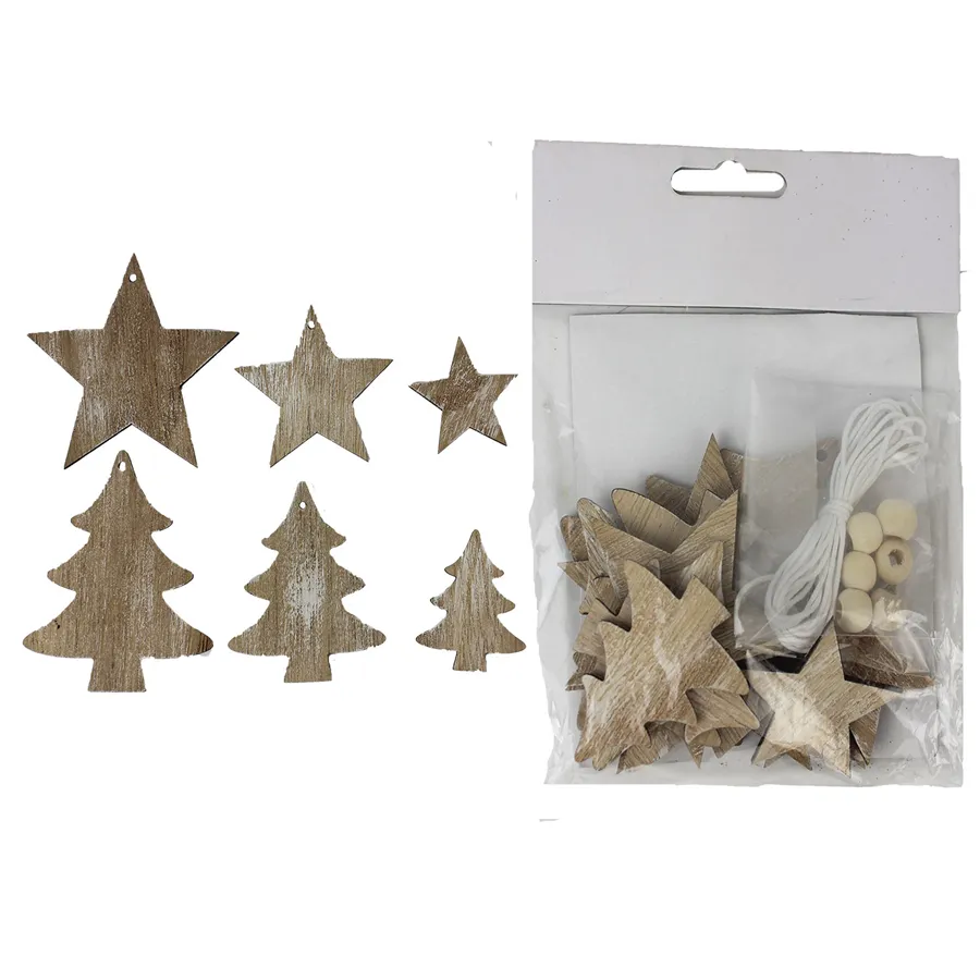 Set enthält 12 Stück 3 Größen Bäumen und Sternen 6 x Bäume 6 x Sterne Set enthält Schnur und Perlen Farbe: natürlich Material: Alternative zu Holz