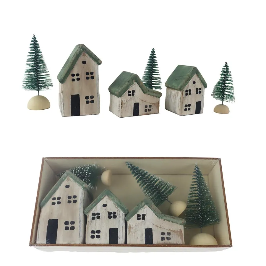 Dekoratives Holzdorf in einer Kiste. Die Box enthält 3 Häuser, 3 Bäume.