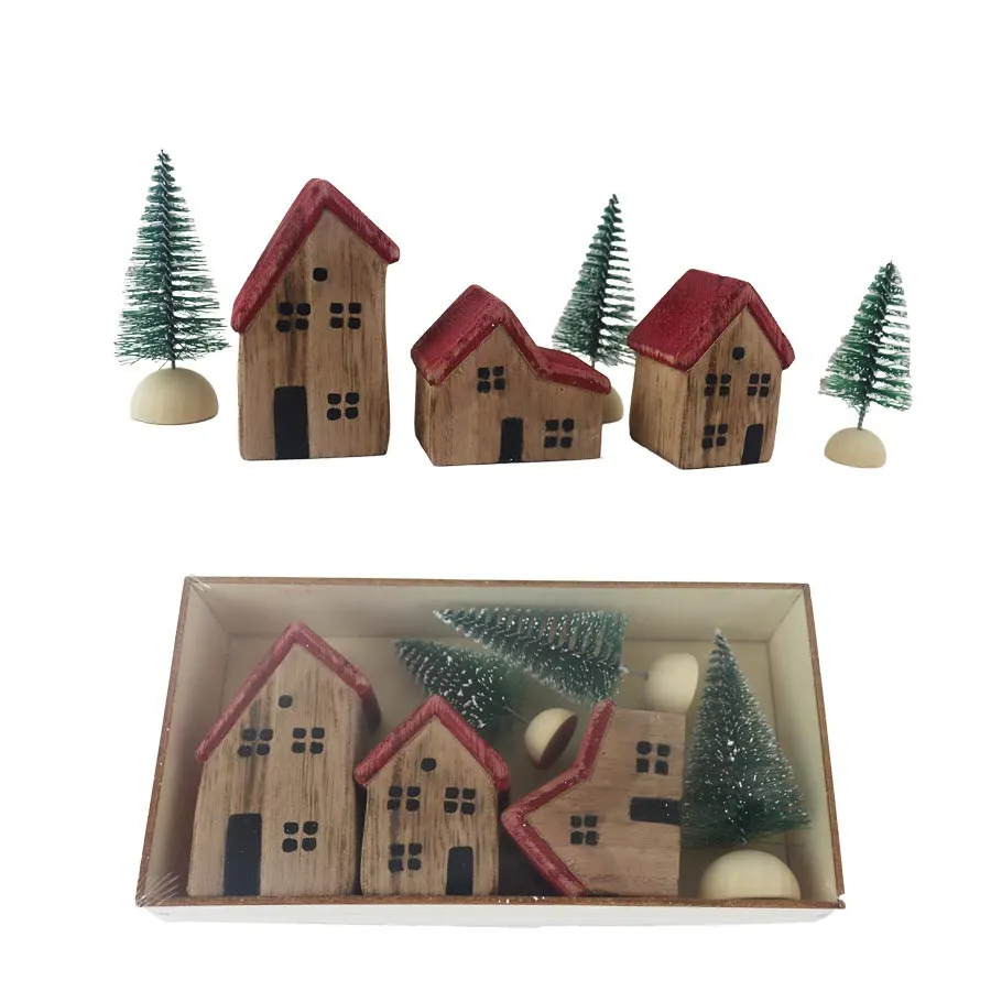 Dekoratives Holzdorf in einer Kiste. Die Box enthält 3 Häuser, 3 Bäume.