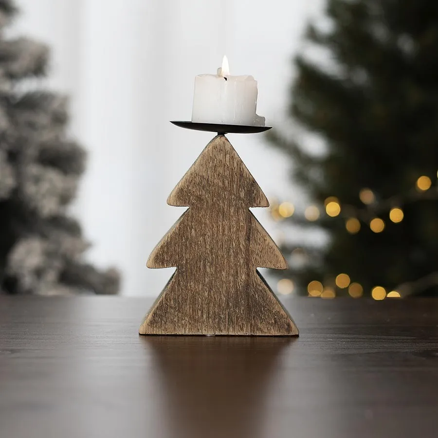 Dekorativer Kerzenständer aus Holz für eine Kerze in Form eines Baumes.