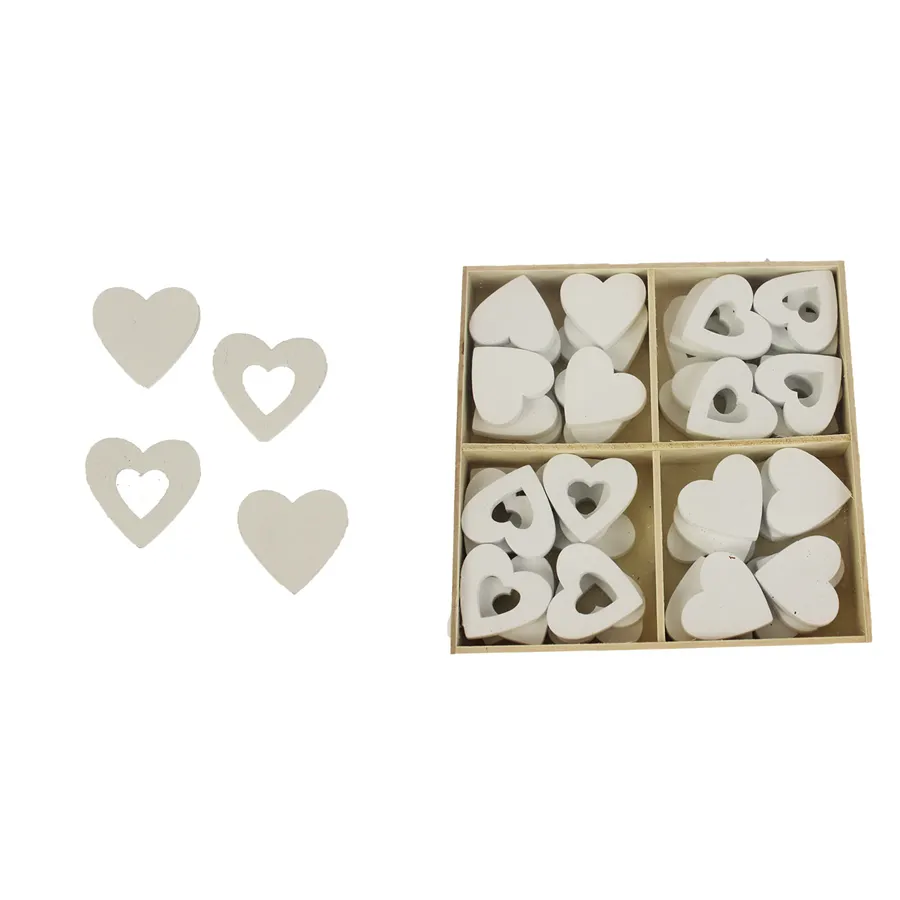 Set-Herzen Enthält 48 St. Maße: Breite 2,8 cm, Dicke 0,4 cm, Höhe 2,8 cm. Farbe: Weiß. Material: Holz.
