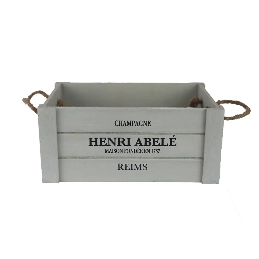 Mittelgroße Holzkiste zum Bepflanzen. Maße: 25,5 x 17,5 cm, Höhe 11 cm. Graue Farbe. Material auf Holzbasis.