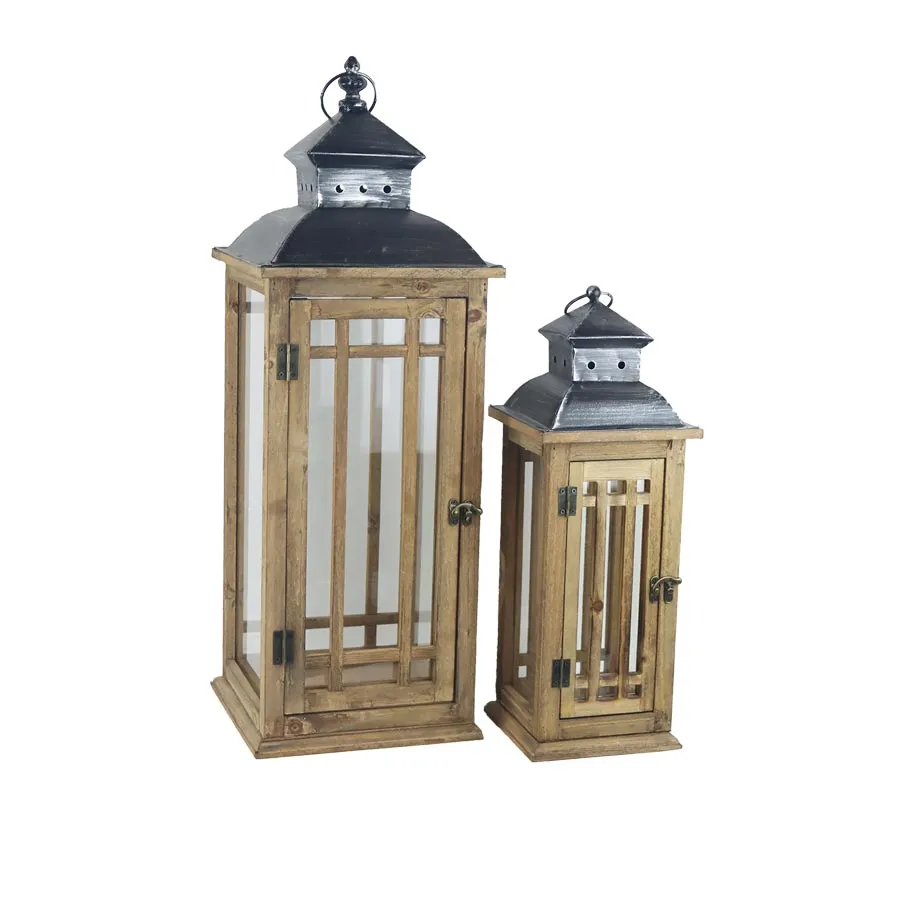 Ein Satz Holzlaternen. Im Set sind 2 Laternen in zwei Größen enthalten. Die kleine Laterne hat die Maße: 16,5 x 16,5 cm, Höhe 46,5 cm. Die große Laterne hat die Maße: 24 x 24 cm, Höhe 68 cm. Bringen Sie den Charme des orientalischen Stils in Ihr Haus oder Ihren Garten. Diese Laternen bestehen aus Holz und Glasplatten, der obere Teil besteht aus Metall. Die Laternen verfügen über einen praktischen Griff, der Ihnen den Transport zwischen Haus und Garten erleichtert.