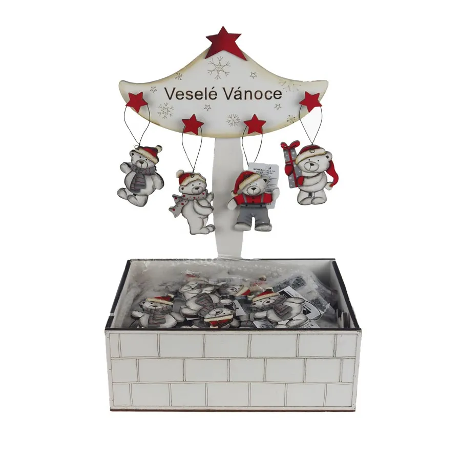 Holzschmuck für den Baum in einer Kiste. Die Box enthält 72 Teddybären, 4 Teddybärarten.