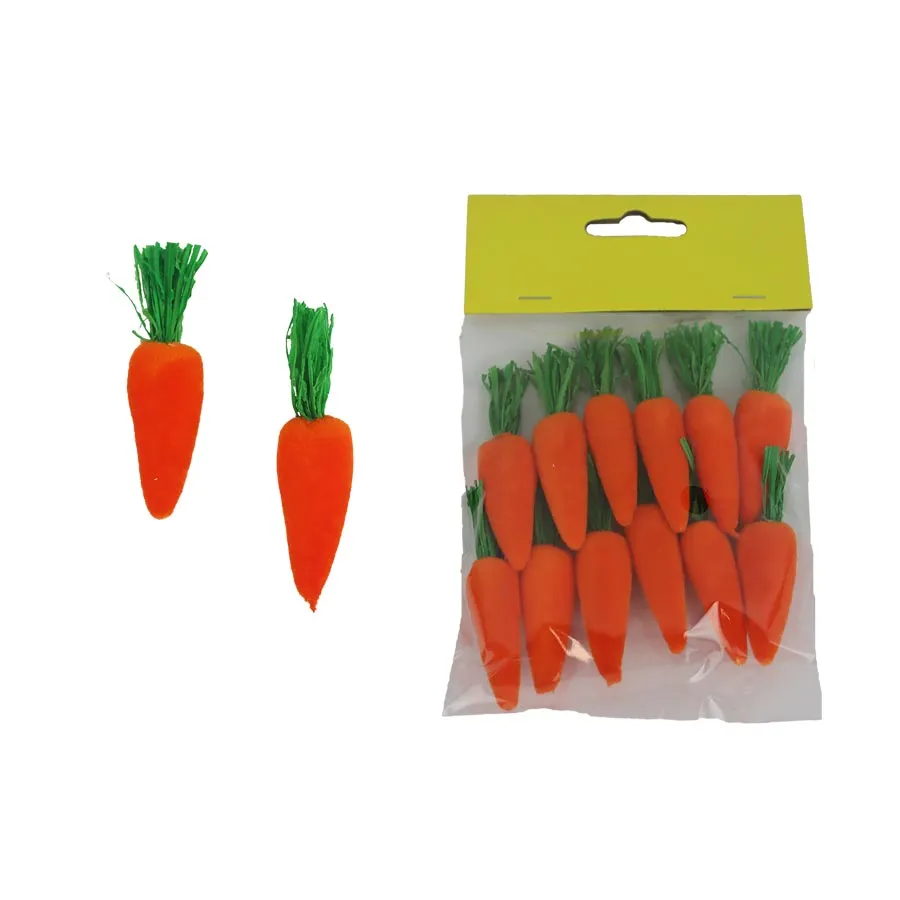 Dekorative Karotte. Die Tüte enthält 12 Dekorationen. Maße: 1,5 x 1 cm, Höhe 6,2 cm. Farbe: Kombination Orange, Grün. Material: Kunststoff, Schaumstoff.