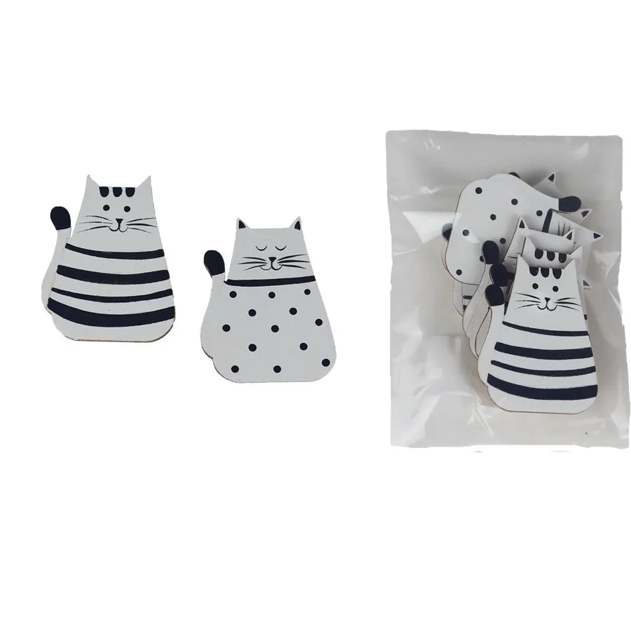 Set dekorativer Katzen mit Kleber. Das Set enthält 6 Dekorationen. Abmessungen: 3,6 x 4,8 cm, Dicke 0,2 cm. Farbe: Kombination aus Weiß und Schwarz. Material auf Holzbasis.