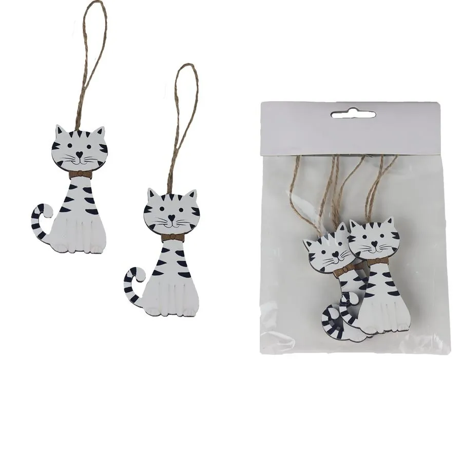 Set Deko-Katzen zum Aufhängen. Das Set enthält 3 Katzen. Abmessungen: 4,5 x 7,5 cm, Dicke 0,4 cm. Farbe: Kombination aus Weiß und Schwarz. Material auf Holzbasis.