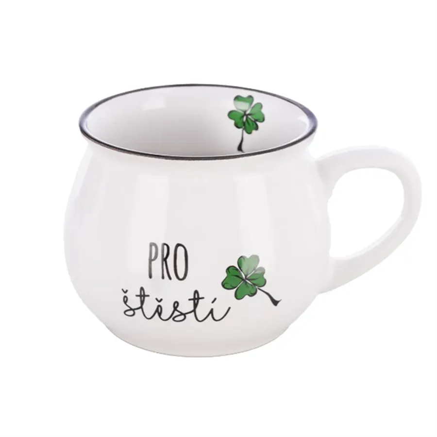 Henkelbecher mit „Für Glück“-Aufdruck. Inklusive Widmungsanhänger. Spülmaschinen- und maschinenwaschbar.