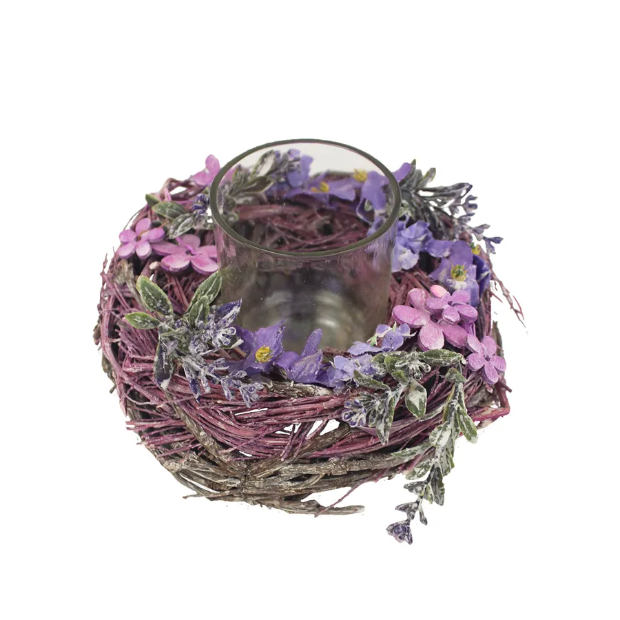 Dekoration - Kerzenhalter. Farbe: natürlich mit violetten Blüten. Material: Weide, Dekorationen.