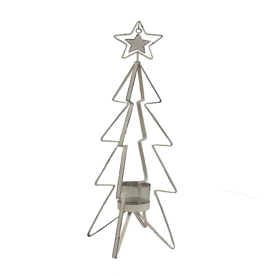 Kerzenhalter für eine Kerze. Maße: 10 x 10 cm, Höhe 31 cm. Weiße Farbe. Material: Metall, Glas.