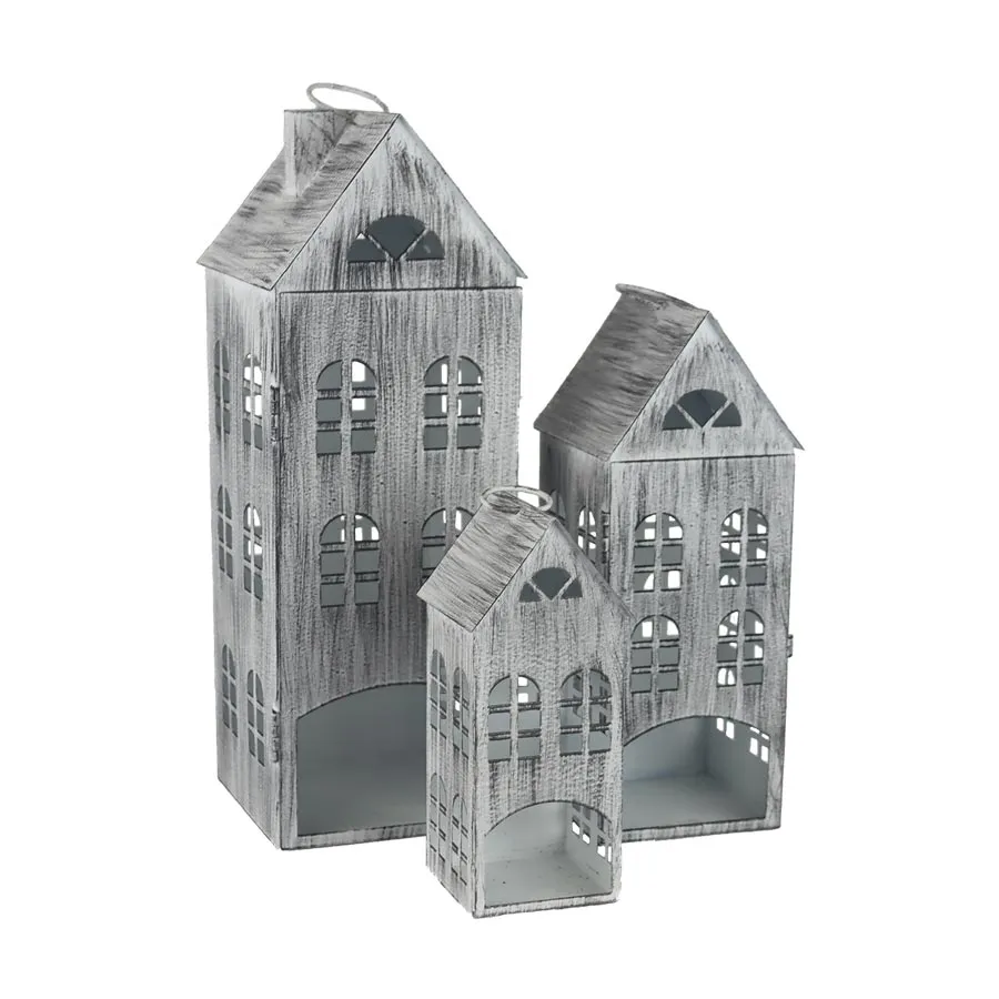 Set dekorativer Kerzenhäuser. Das Set enthält 3 Häuser in drei Größen. Das kleine Haus hat die Maße: 7,5 x 8 cm, Höhe 21,5 cm. Das mittlere Haus hat die Maße: 10,5 x 10,5 cm, Höhe 29 cm. Das große Haus hat die Maße: 12,5 x 13 cm, Höhe 38 cm.