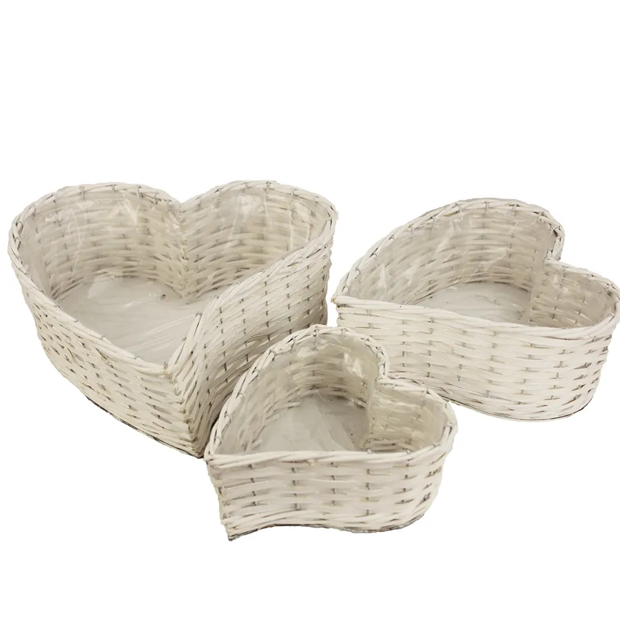 Herzförmige Blumentöpfe. Set enthält 3 St. Maße: Klein: 22,5 x 22,5 cm, Höhe 8,5 cm Medium: 29 x 31 cm, Höhe 10,5 cm Groß: 36 x 40 cm, Höhe 12,5 cm. Farbe: Weiß. Material: Weide, Kunststoff.