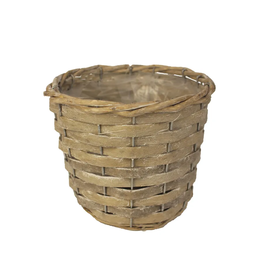 Blumentopf mit Plastikfolie. Maße: Durchmesser 15 cm, Höhe 12 cm. Farbe: Grau. Material: Weide, Kunststoff.