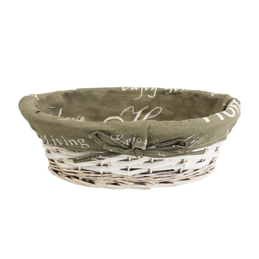 Schöner Korb mit Stoff - oval. Maße: 30 x 20 cm, Höhe 10 cm Farbe: weiß, Stoff - grau Material: Weide, Stoff