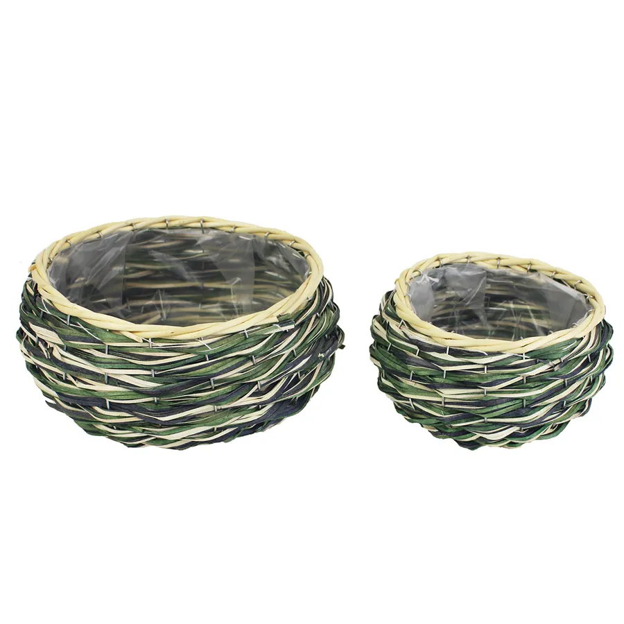 Set aus Weidenverpackungen mit Kunststoff.Set beinhaltet 2 Hüllen.Das kleine Paket hat einen Durchmesser von 18 cm, eine Höhe von 11,5 cm.Die Großverpackung hat einen Durchmesser von 27 cm, eine Höhe von 13,5 cm.Farbe : grün.Material: Weide, Kunststoff.