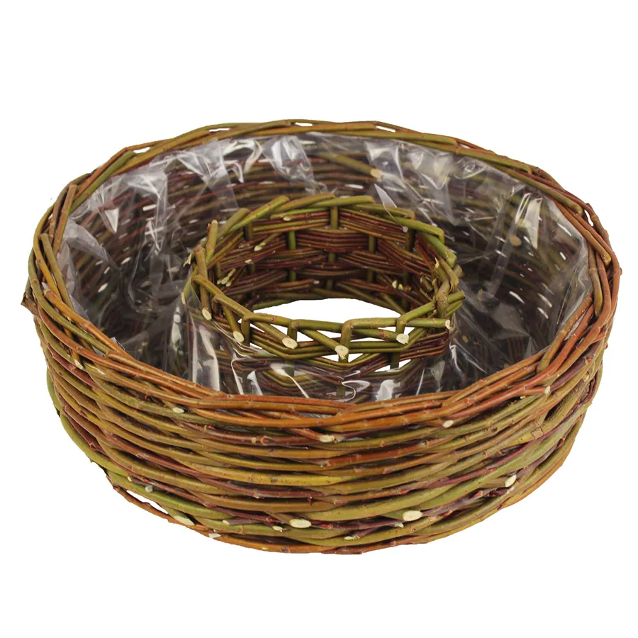 Weiden runder Blumentopf. Mit Plastikfolie. Maße: Durchmesser 40 cm, Höhe 12 cm. Farbe: Braun. Material: Weide, Kunststoff.