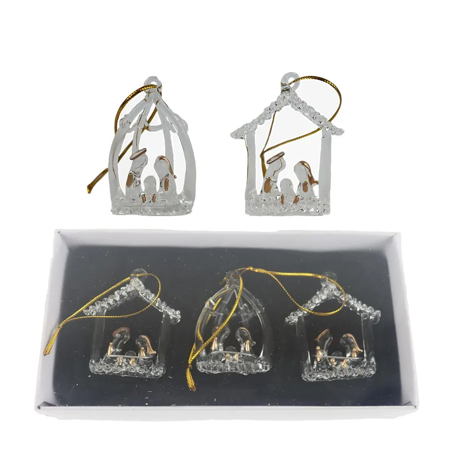 Set mit dekorativen Krippen zum Aufhängen. Das Set enthält 3 Krippen. Abmessungen : 3,5 x 0,7 - 1,5 cm, Höhe 5 - 5,3 cm. Farbe : Klarglas, gold. Material : Glas.