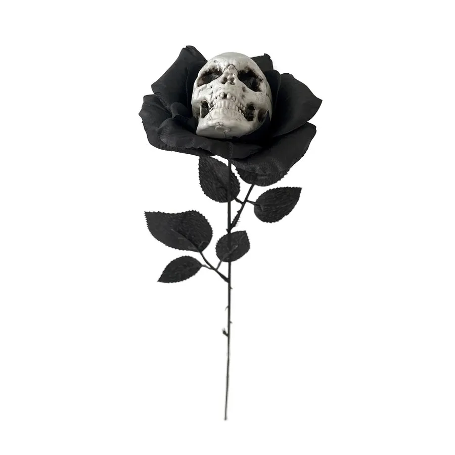 Gruselige künstliche schwarze Rose mit einem realistischen Schädel in der Mitte. Perfekte Ergänzung zu Halloween-Dekorationen und dunklen Arrangements.