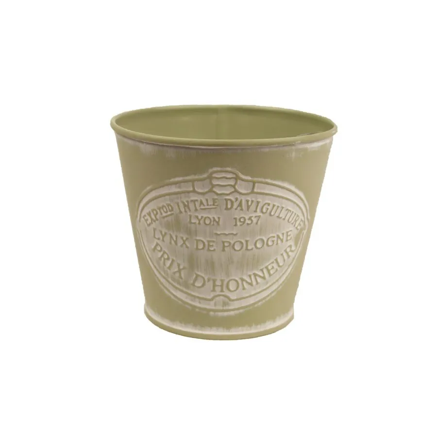 Blumentopf aus Zinn. Maße: Durchmesser 11 cm, Höhe 10 cm. Farbe grün. Material: Blech.