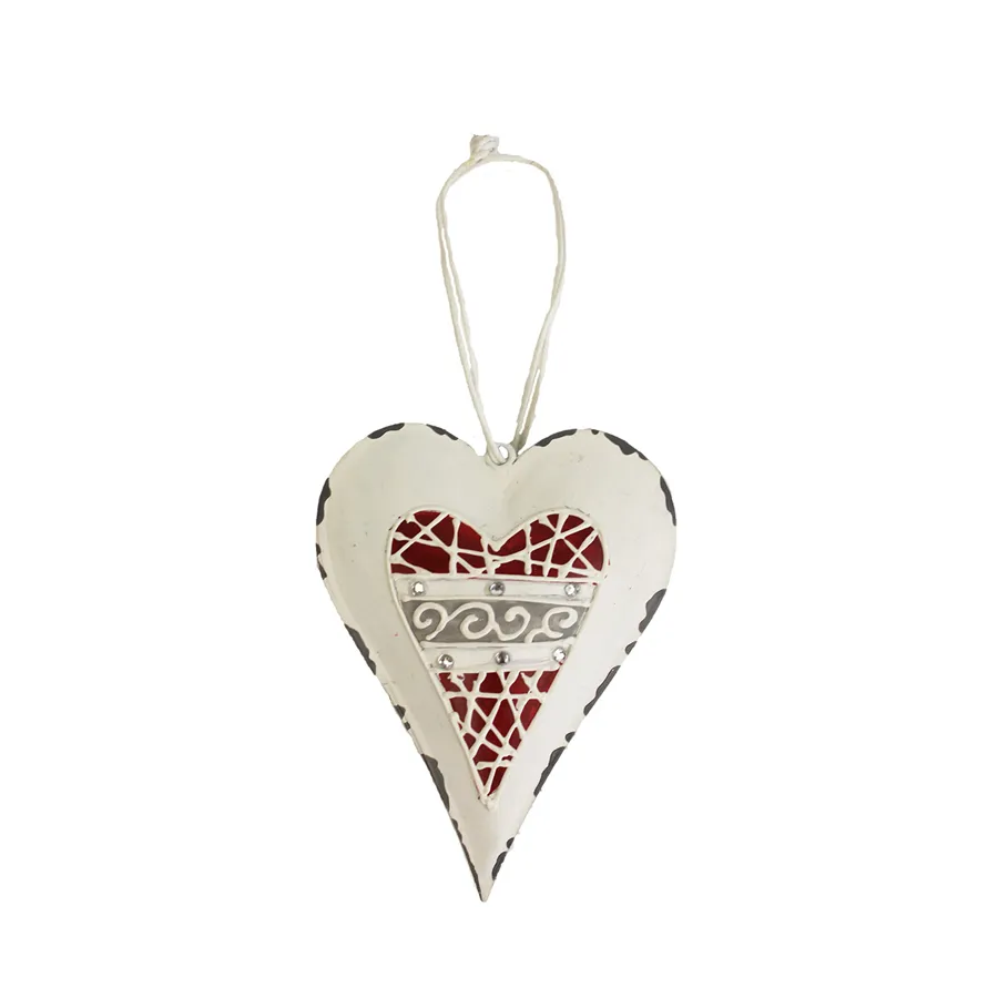 Schönes Metallherz. Maße: Breite 7,5 cm, Dicke 2 cm, Höhe 10 cm. Farbe: Kombination weiß, rot, grau Material: Metall