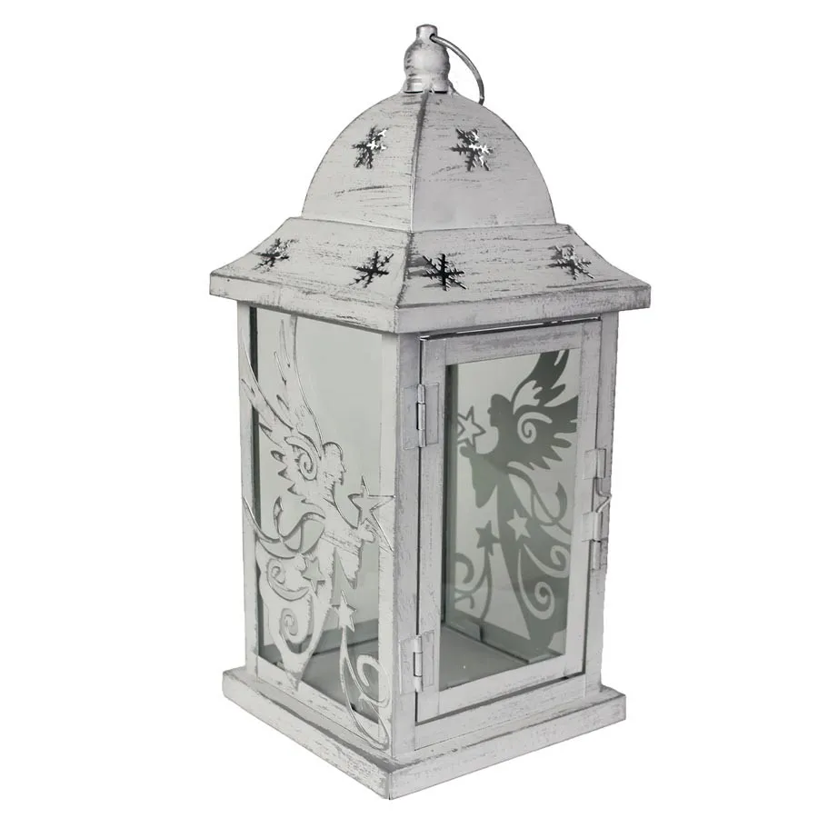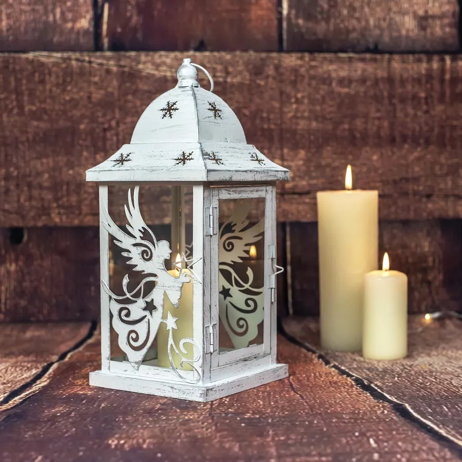 Schöne Metalllaterne mit Engeln.Abmessungen: 14 x 14 cm, Höhe 32 cm.Farbe: weiß.Material: Metall, Glas.