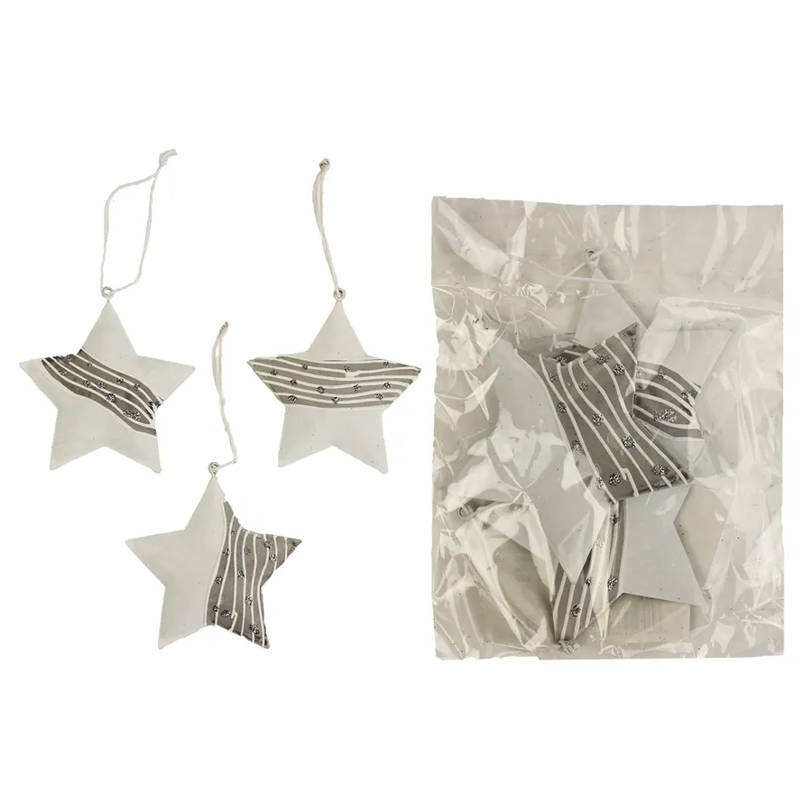 Dekorativer Stern zum Aufhängen. Set enthält 3 St. Maße: Durchmesser 8 cm, Dicke 1 cm Farbe: Kombination weiß und grau Material: Metall