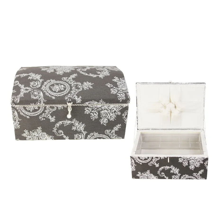 Die Kassette enthält ein Kunststofffach. Maße: 27 x 19 cm, Höhe 14 cm. Material: Stoff.