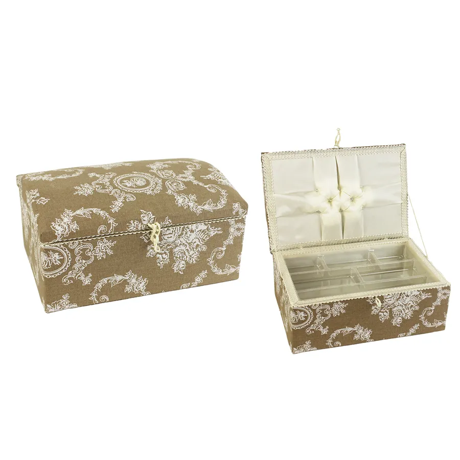 Nähkästchen. Maße: 27 x 19 cm, Höhe 14 cm Material: Stoff Mit abnehmbares Fach aus transparentem Kunststoff.
