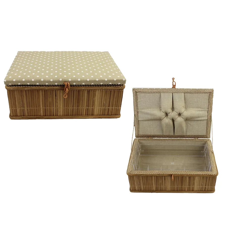Nähkästchen mit Stoffdeckel. Maße: 27 x 19 cm, Höhe 12 cm Material: Bambus, Stoff Mit abnehmbares Fach aus transparentem Kunststoff.