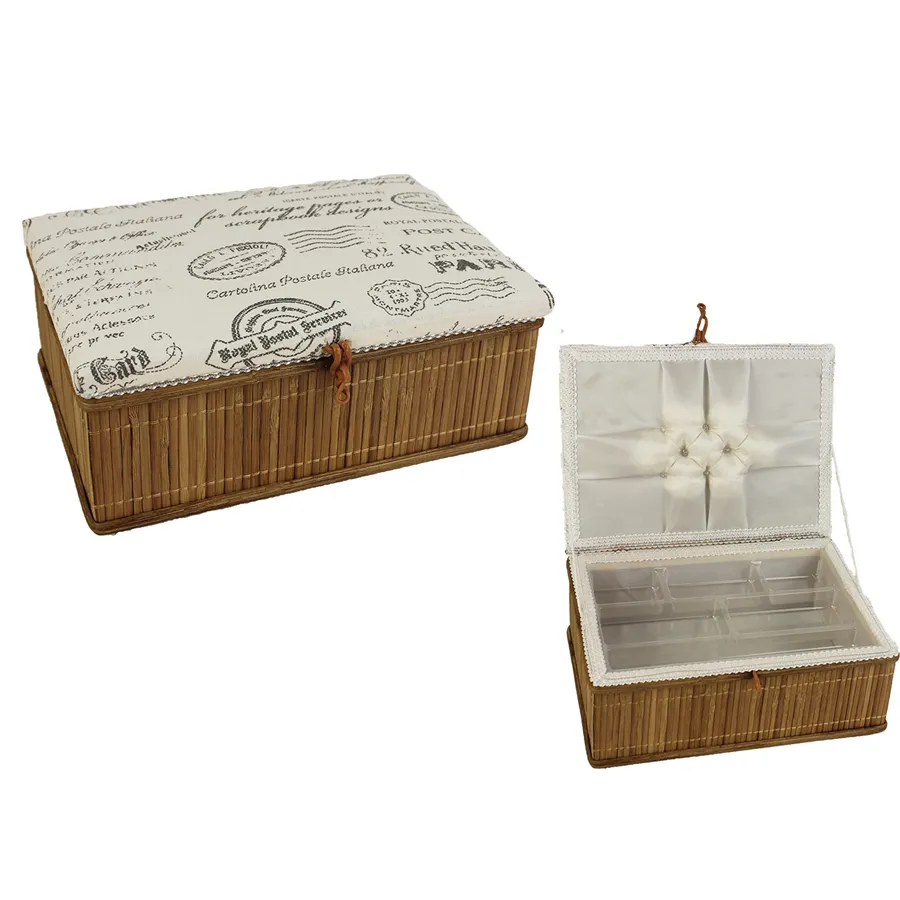 Nähkästchen mit Stoffdeckel. Maße: 27 x 19 cm, Höhe 12 cm Material: Bambus, Stoff Mit abnehmbares Fach aus transparentem Kunststoff.