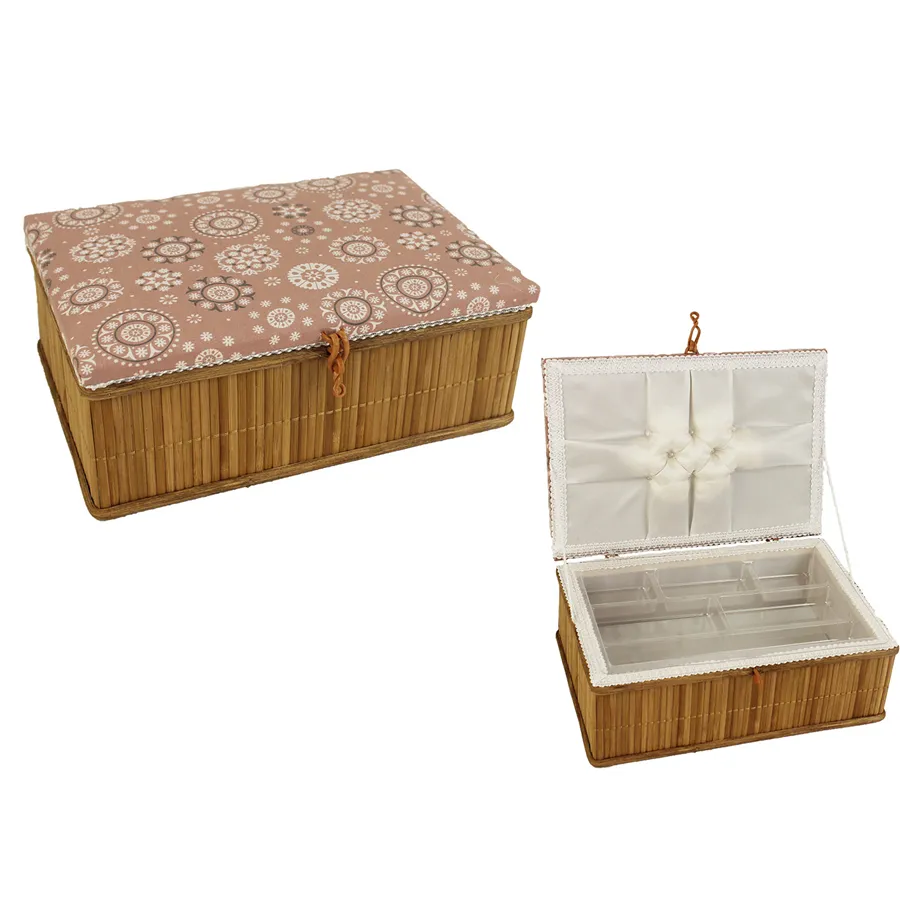 Nähkästchen mit Stoffdeckel. Maße: 27 x 19 cm, Höhe 12 cm Material: Stoff, Bambus Mit abnehmbares Fach aus transparentem Kunststoff.