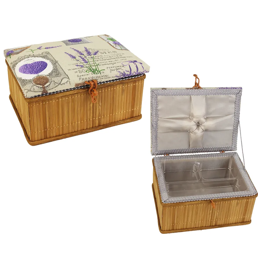 Maße: 22 x16 cm, höhe 11 cm Mit abnehmbarem Fach aus transparentem Kunststoff Material: Stoff, Bambus
