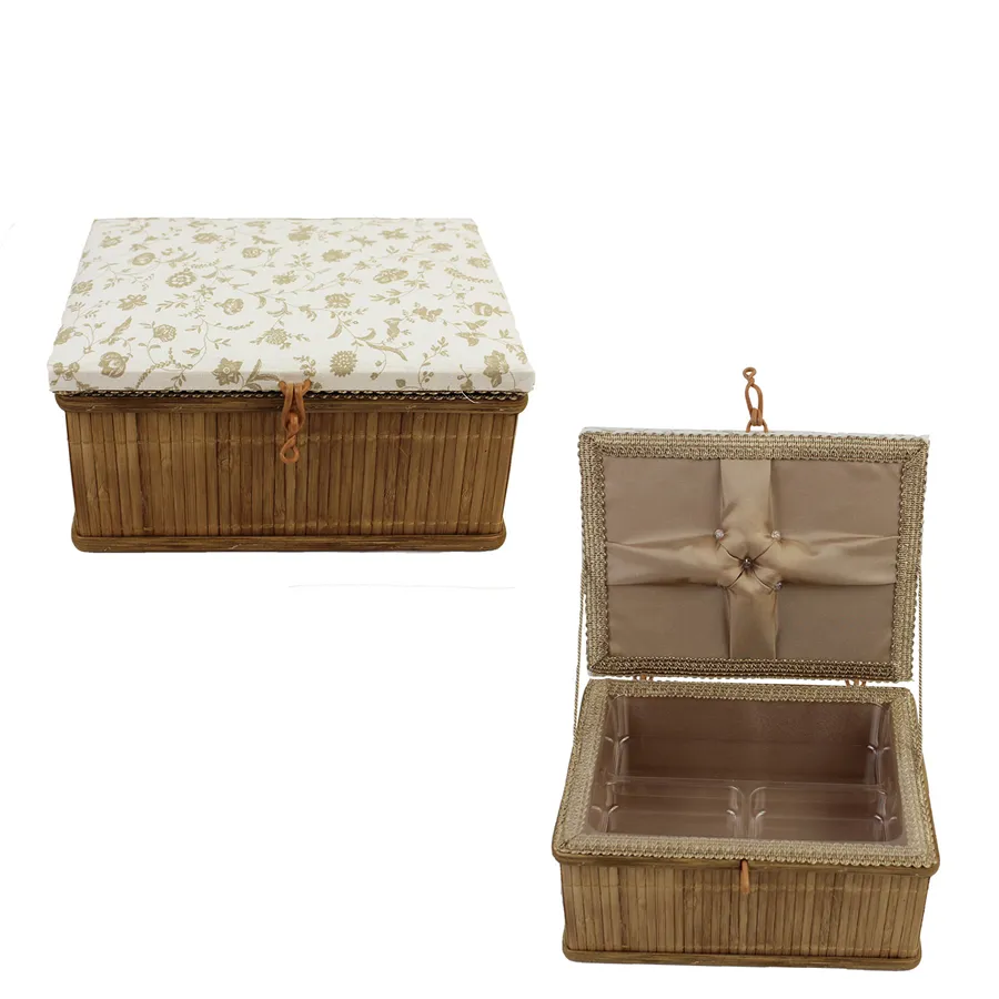 Nähkästchen mit Stoffdeckel. Maße: 22 x 16 cm, Höhe 11 cm Material: Stoff, Bambus Mit abnehmbares Fach aus transparentem Kunststoff.