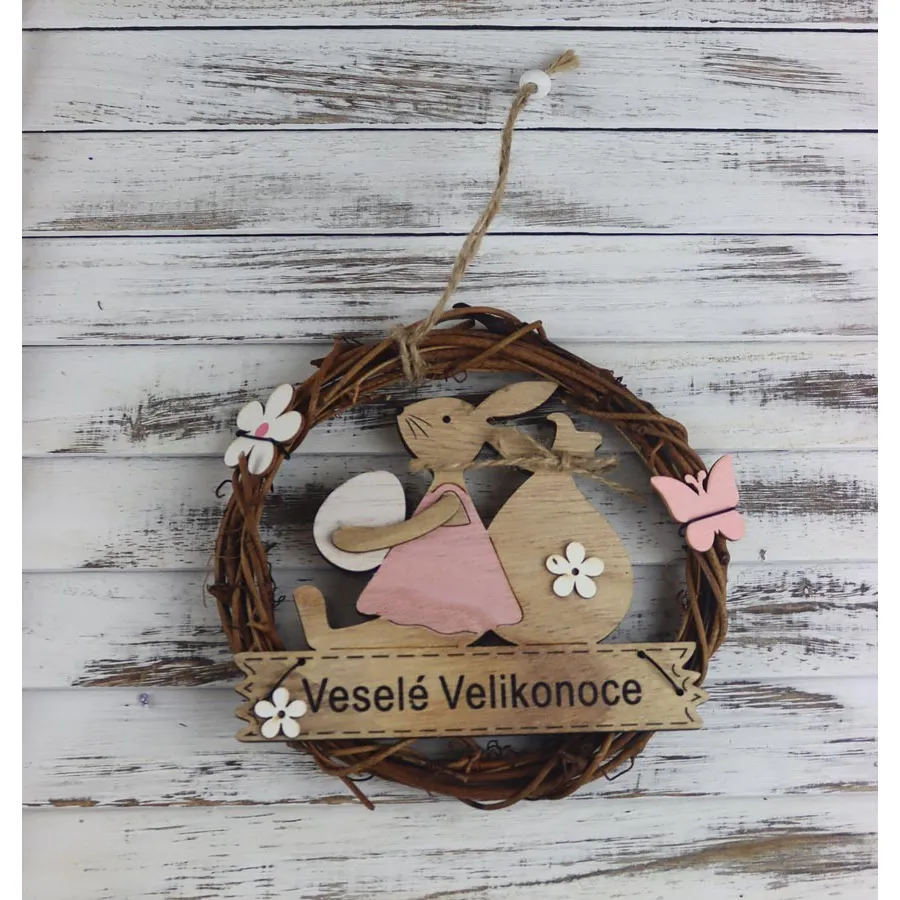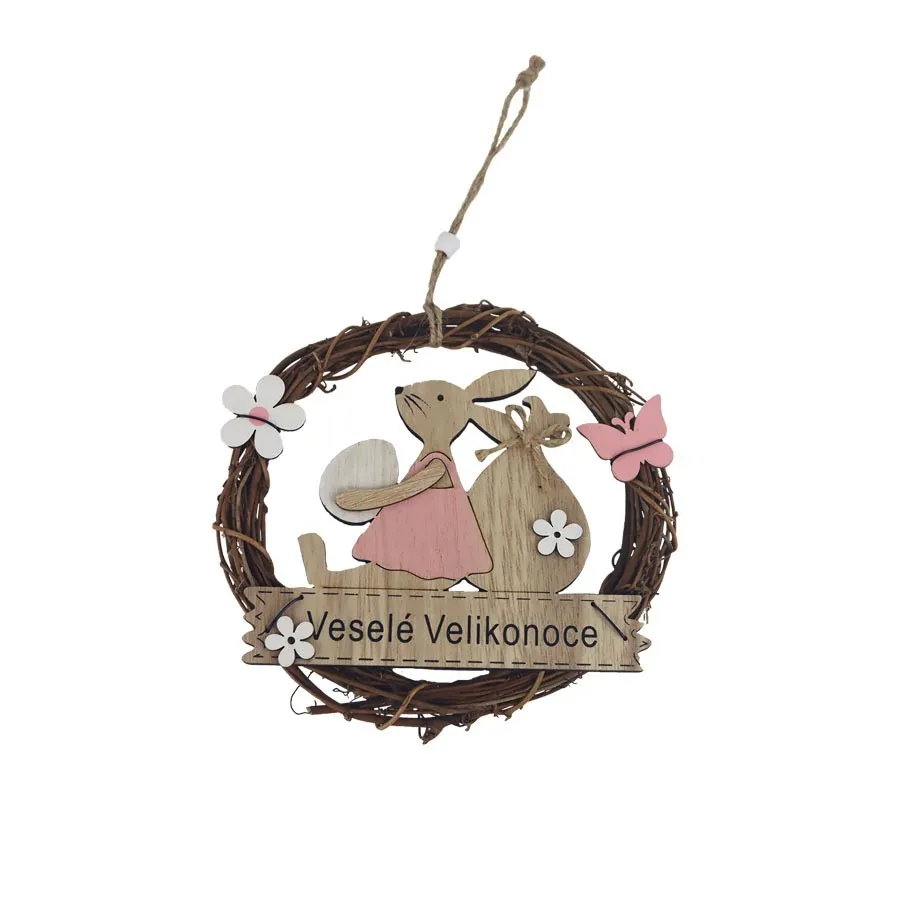 Dekorativer Kranz zum Aufhängen. Maße: Durchmesser 15 cm, Dicke 2,5 cm. Farbe: Kombination aus Natur, Rosa, Weiß. Material auf Holzbasis.