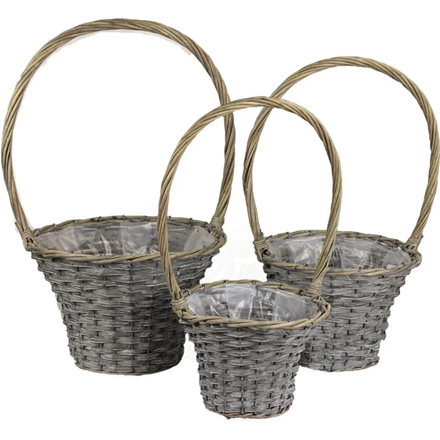 Set von 3 Stück. Größen der Körbe: Klein: Durchmesser 20 cm. Die Höhe mit Griff ist 43 cm (ohne 15 cm). Mittel: Durchmesser 25 cm. Die Höhe mit Griff ist 46 cm (ohne 17 cm). Groß: Durchmesser 30 cm. Die Höhe mit Griff beträgt 50 cm (ohne 19 cm). Abmessungen: Bitte beachten Sie alle angegebenen Maße sind ungefähr, die Körbe sind alle handgefertigt und daher einzigartig. Die angegebenen Maße sind ein Hinweis auf die ungefähre Größe, auch die Farbe können aber leicht variieren. Varianz der Größe + -2 cm.