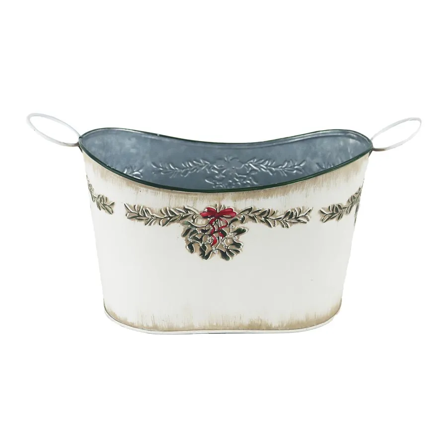 Ovale Weihnachtsziertopf aus Blech zum Bepflanzen.