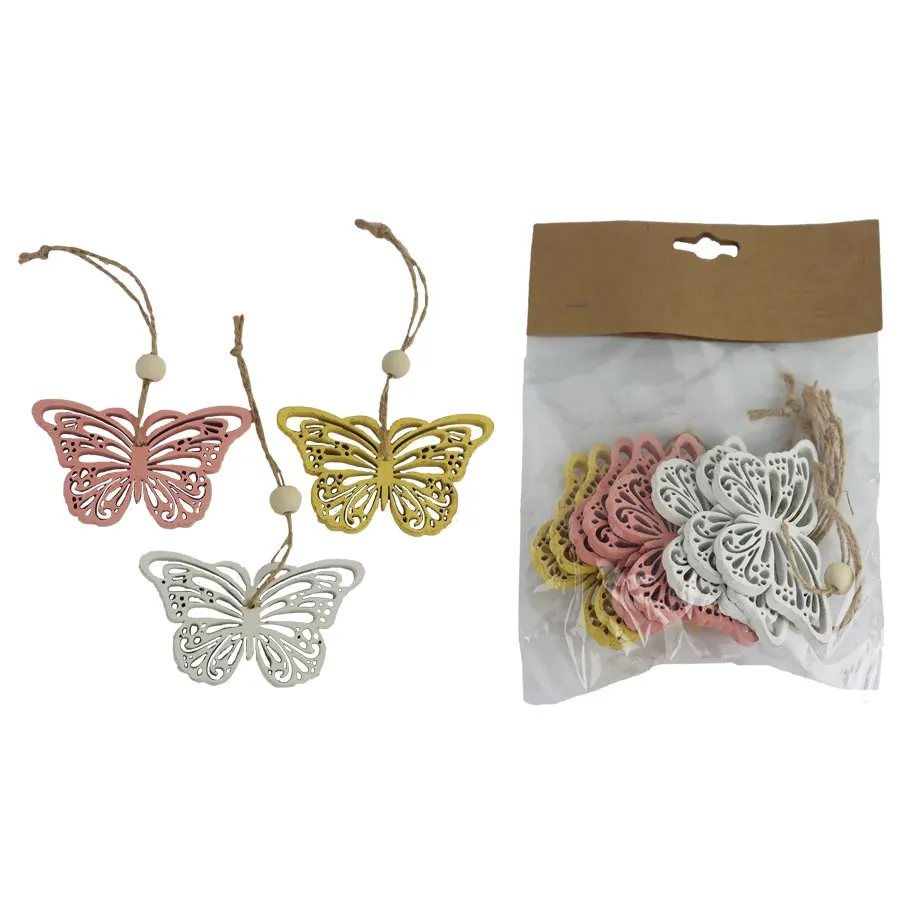 Set dekorative Fliegen zum Aufhängen. Das Set enthält 8 Fliegen. Maße: 7,5 x 0,5 cm, Höhe 4,5 cm. Farbe: Kombination aus Weiß, Gelb, Rosa. Material auf Holzbasis.