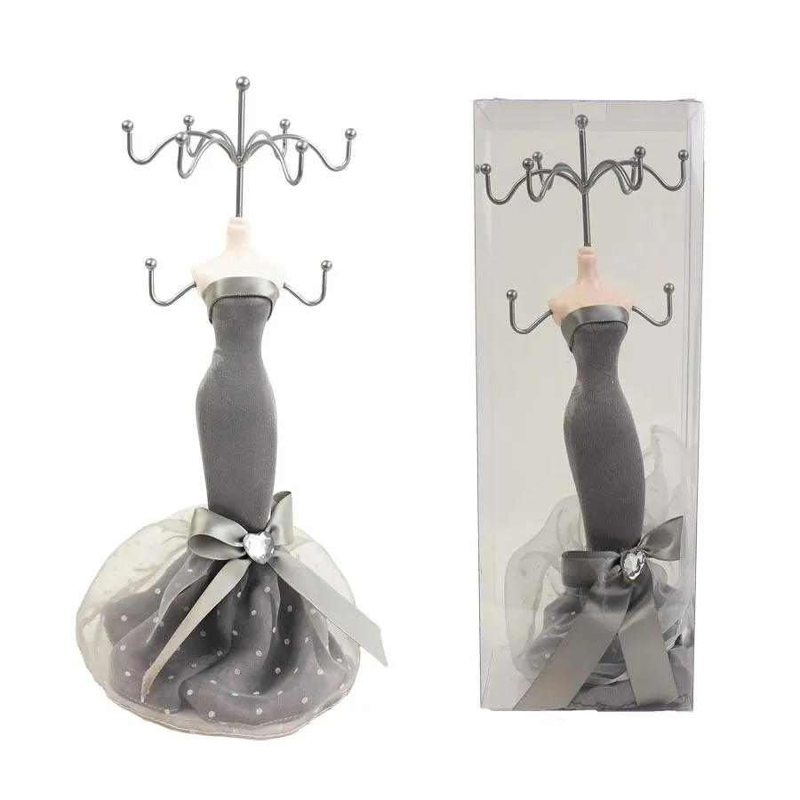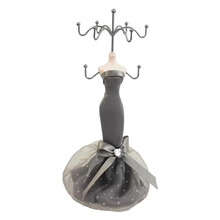 Schmuckständer. Der Stand hat Abmessungen 9,5 x 9 cm, Höhe 27 cm. Der Ständer ist in einer Kunststoffbox verpackt. Farbe: Grau. Material: Polyresin, Stoff, Metall.