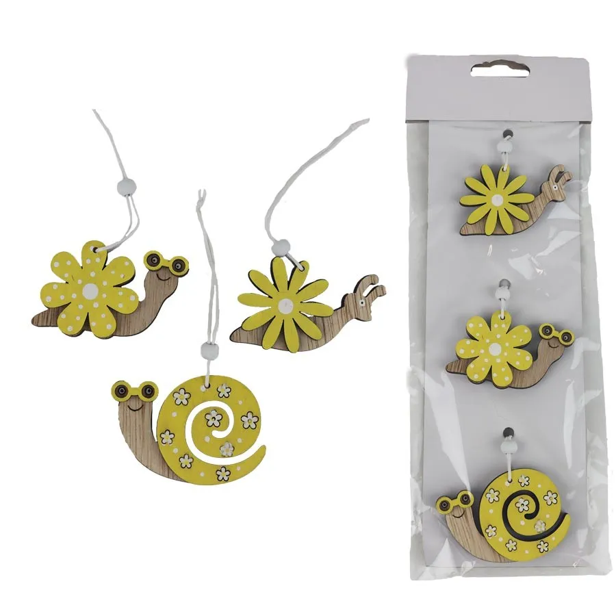 Set Dekoschnecken zum Aufhängen. Im Set sind 3 Schnecken enthalten. Abmessungen: 6,5 x 0,6 cm, Höhe 3,6 - 4,2 cm. Farbe: Kombination Natur, Gelb. Material auf Holzbasis.