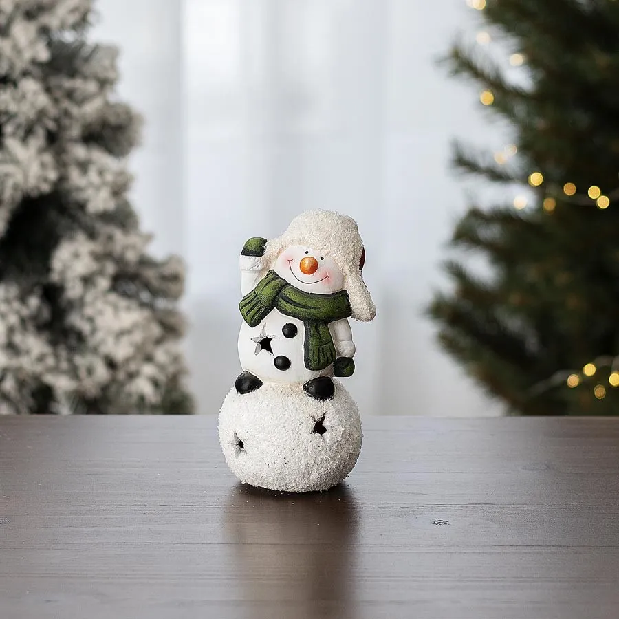 Dekorativer Schneemann mit LED-Beleuchtung. Anzahl der LEDs: 1 Lichtfarbe: Warmweiß. Stromversorgung: 2x 1,5V LR44 DC. Batterien sind im Paket enthalten. Schutzklasse: IP20 (Innenbereich)