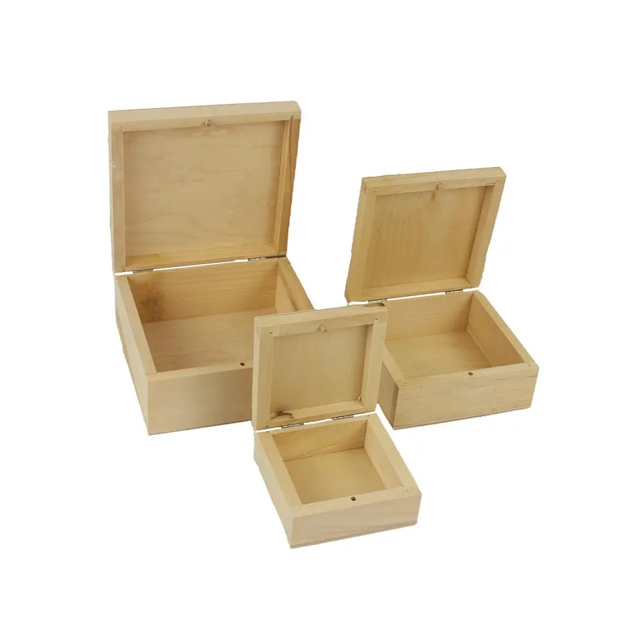 Satz Holzkisten. Das Set enthält drei Boxen in drei Größen. Die kleinste Box hat die Maße: 10 x 10 cm, Höhe 4,7 cm. Die kleine Box hat die Maße: 13 x 13 cm, Höhe 6 cm. Die mittlere Box hat die Maße: 16 x 16 cm, Höhe 7,5 cm. Farbe: natürlich. Material auf Holzbasis.